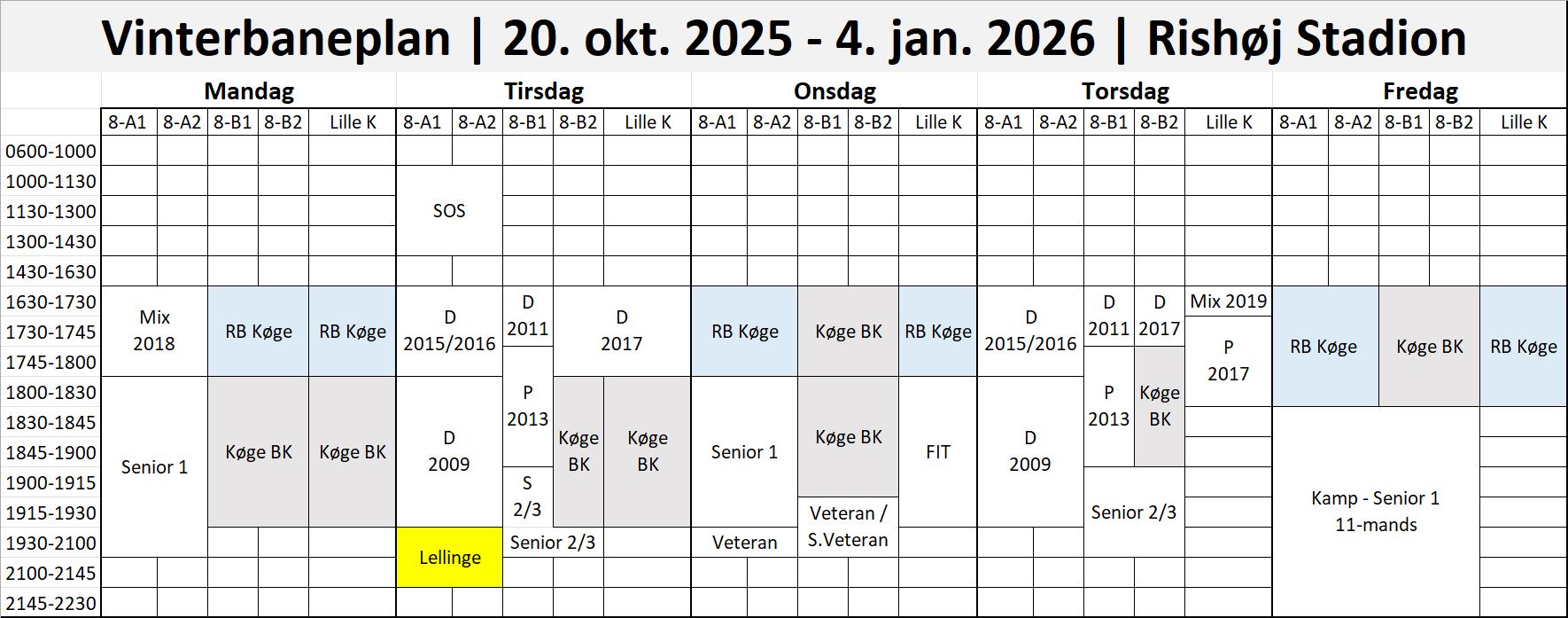 Rishøj stadion består af 4 x 11-mands baner, 2 x 8-mands baner, 4 x 5-mands baner, 2 x 3-mands baner, 1 x multibane samt 1 x Lille kunst.